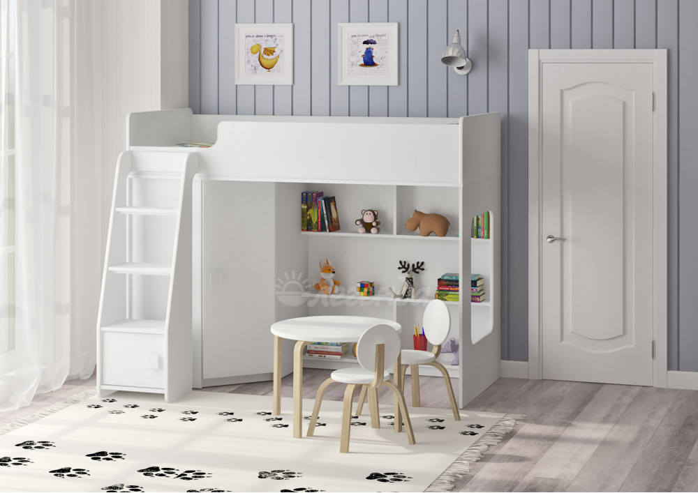 Внизу располагается игровая зона с полками – свой уголок для ребенка.